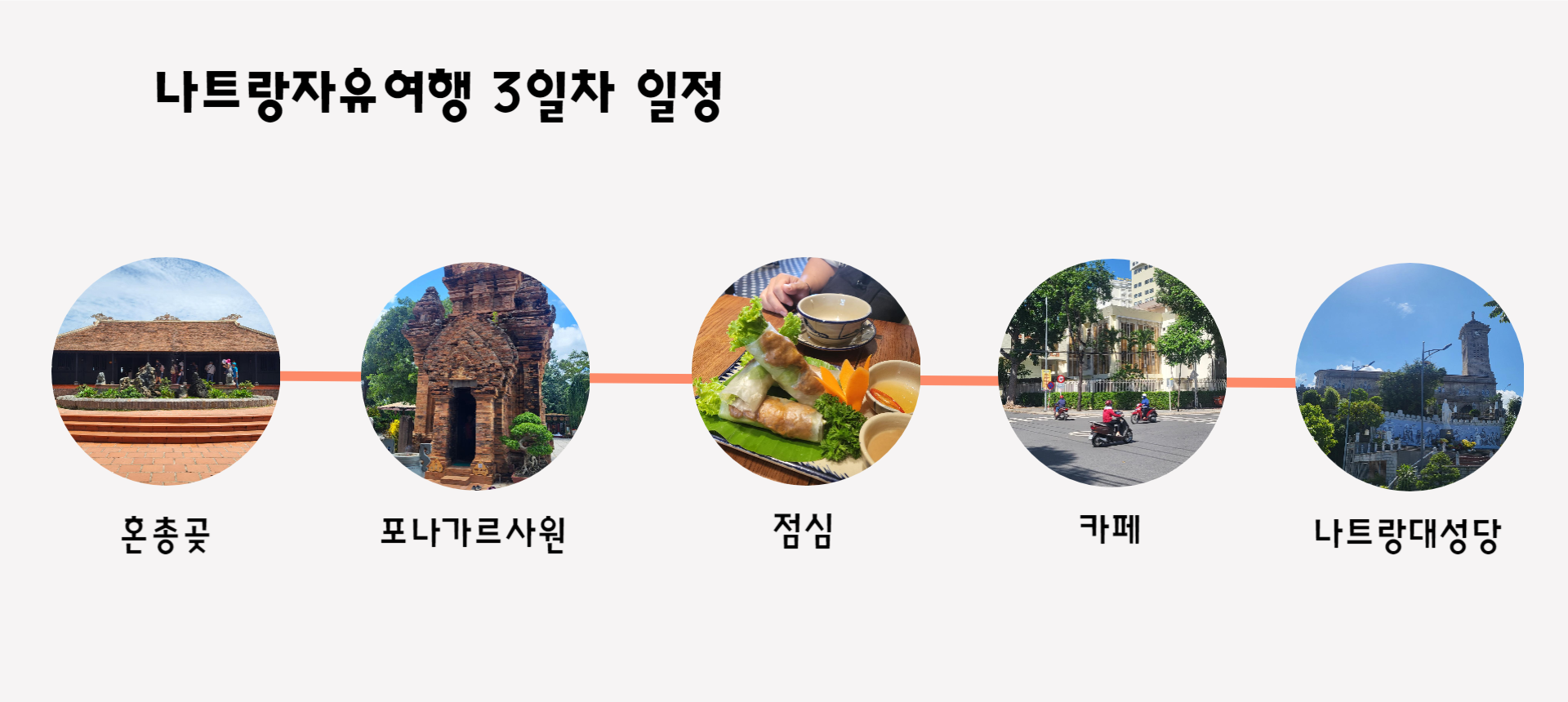 베트남여행 나트랑자유여행 3일차 일정이예요. 천천히 둘러봤다고 하기에는 그래도 다닌곳이 꽤 되는것 같아요 :) 한곳을 둘러보는데 거의 20분 내면 충분하고 이동하는것도 길어야 20분이 걸려서 다닌곳은 많지만 그렇게 빡빡하다고 느껴지지는 않았어요.
