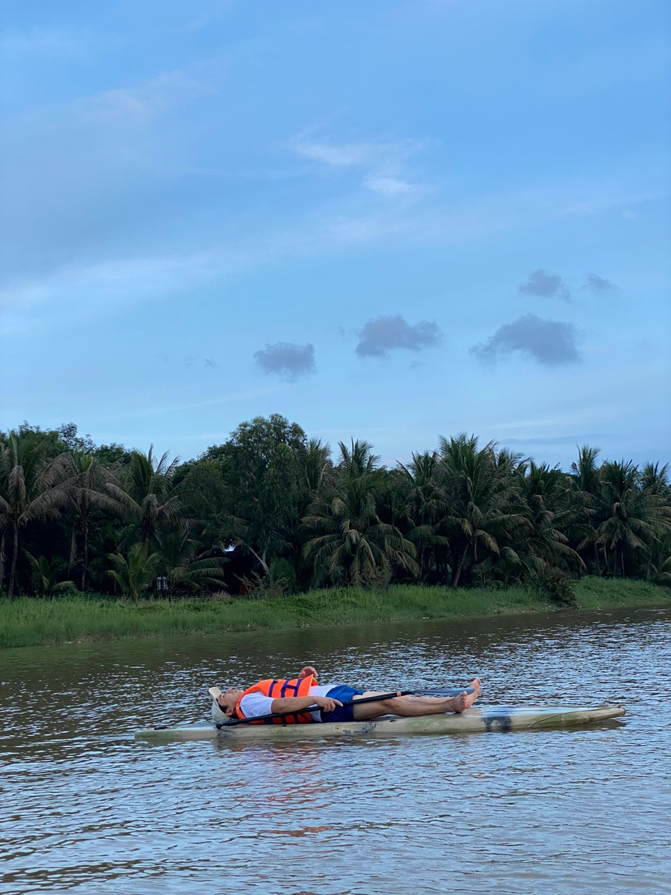 외곽지역으로 이동을 하다 까이강에 도착을 하면 패들보드 타는 곳이 나오고 여기서 구명조끼를 입고 간단하게 안전교육을 받은다음 어디까지 갔다가 돌아오는지 설명을 해주세요.