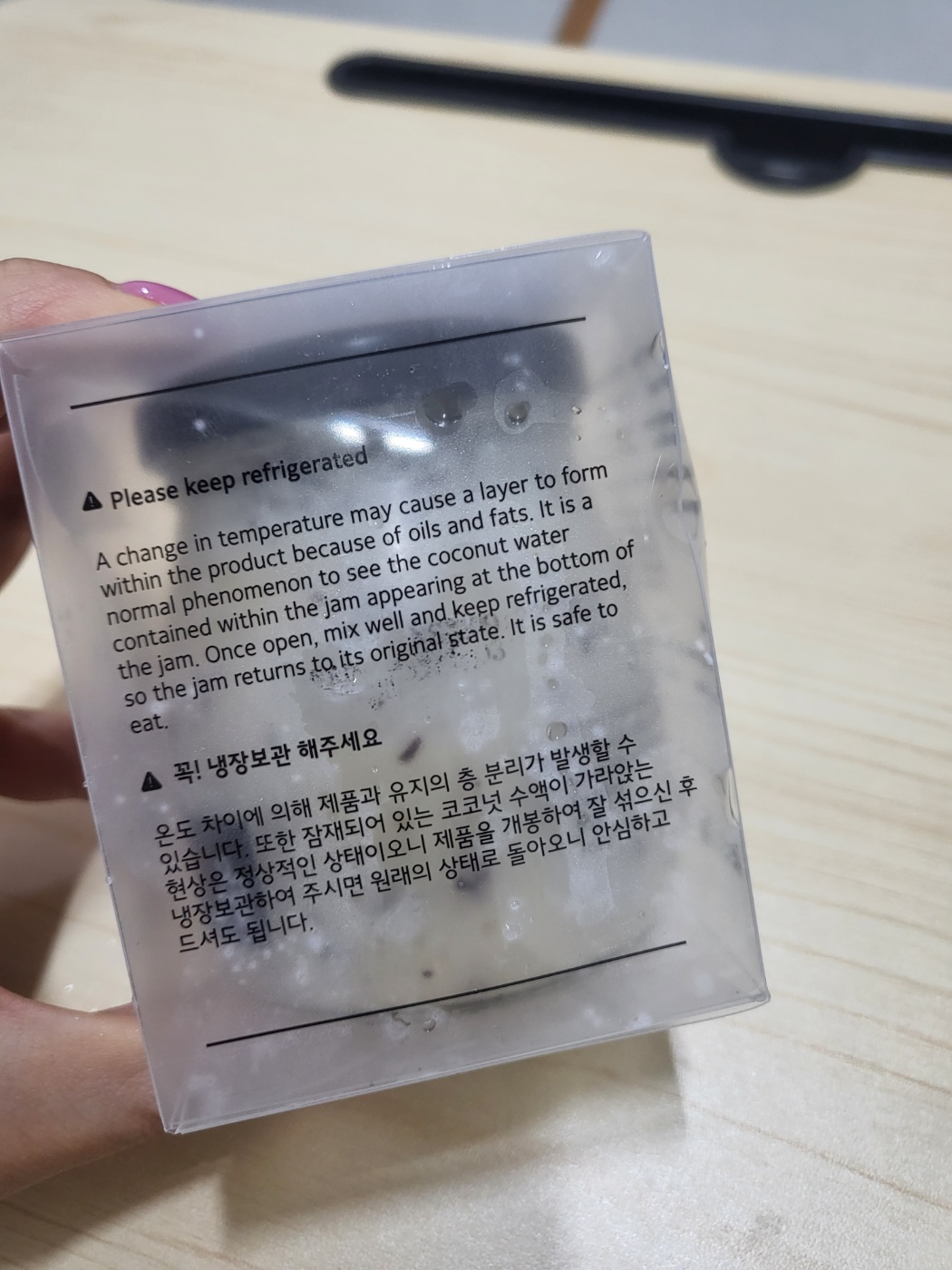 코코넛이 주 재료라 온도가 올라가면 녹아서 물처럼 변해요. 한국으로 오면서 액체로 변하게 되는데 내용물을 흔들어서 냉동or냉장 하게 되면 바로 원래상태로 굳어서 먹을수 있어요.