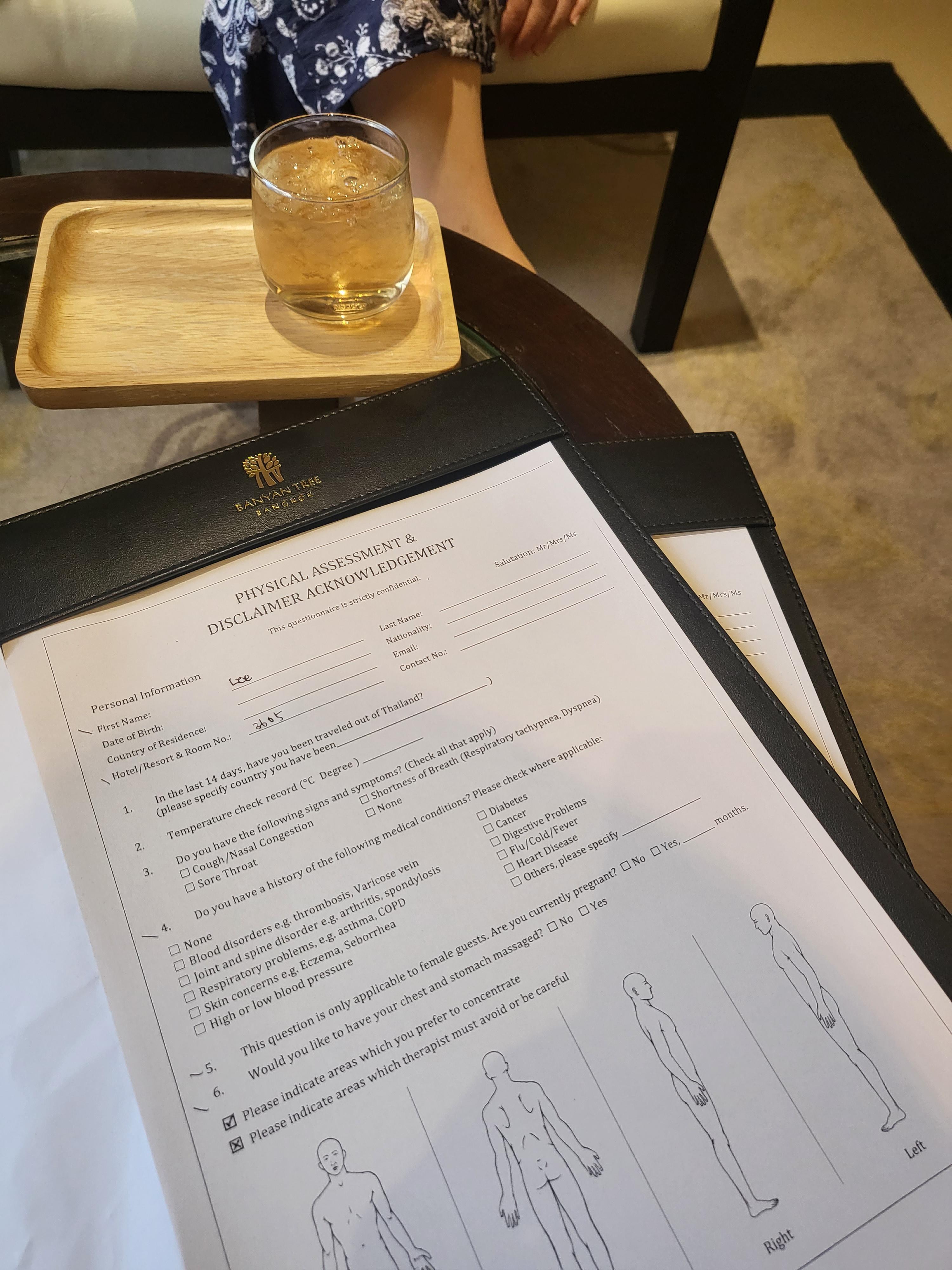 마사지 받기전 간단하게 이름과 고객정보를 작성하고 주로 어디가 많이 불편한지, 몸의 앞면 뒷면 측면 나누어서 표기하는 설문지를 작성했어요.