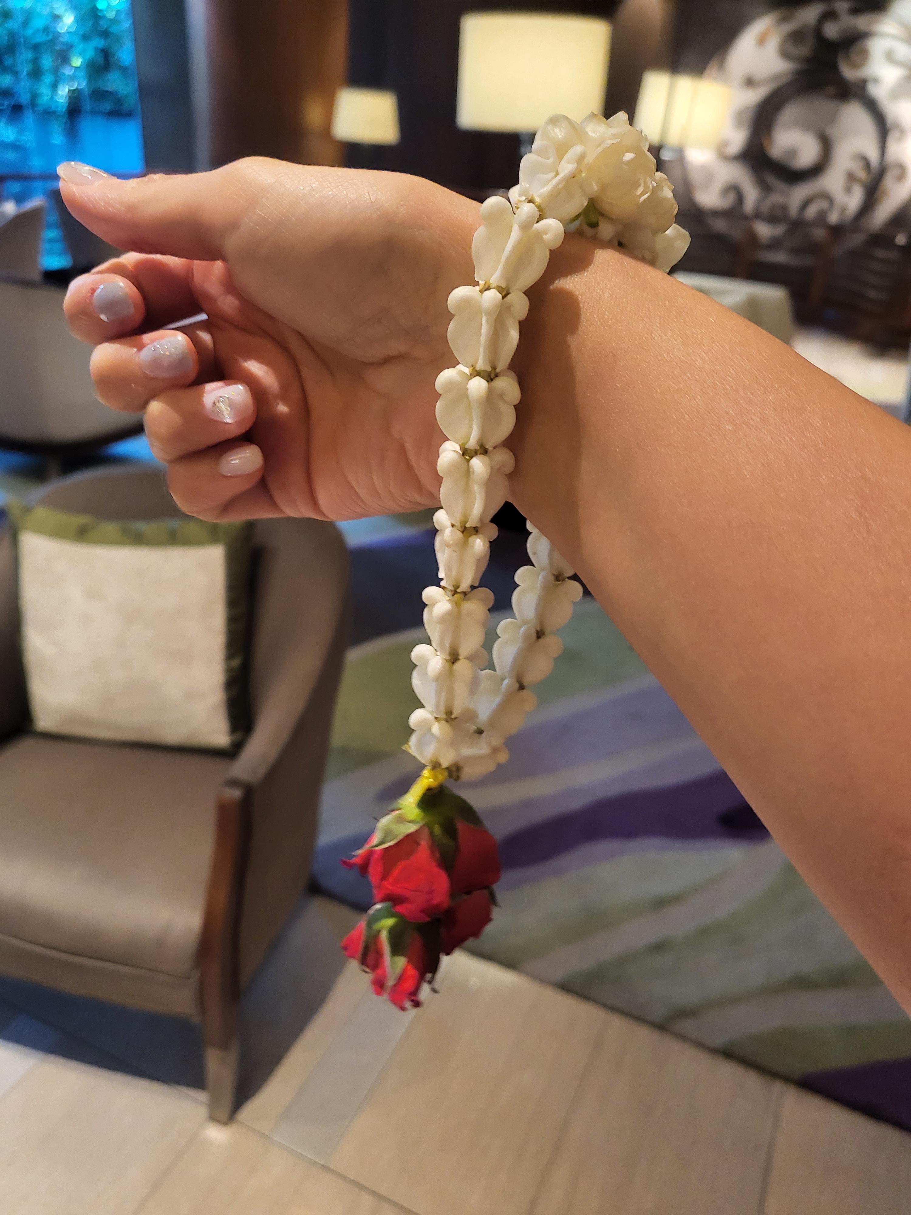 웰컴티와 생화로 만든 팔찌를 선물 받았어요. 흰색의 꽃이 너무 조화스럽고 신기했어요 +-+ 향도 아주 강하더라구요. 예뻐서 시드는게 아깝더라구요