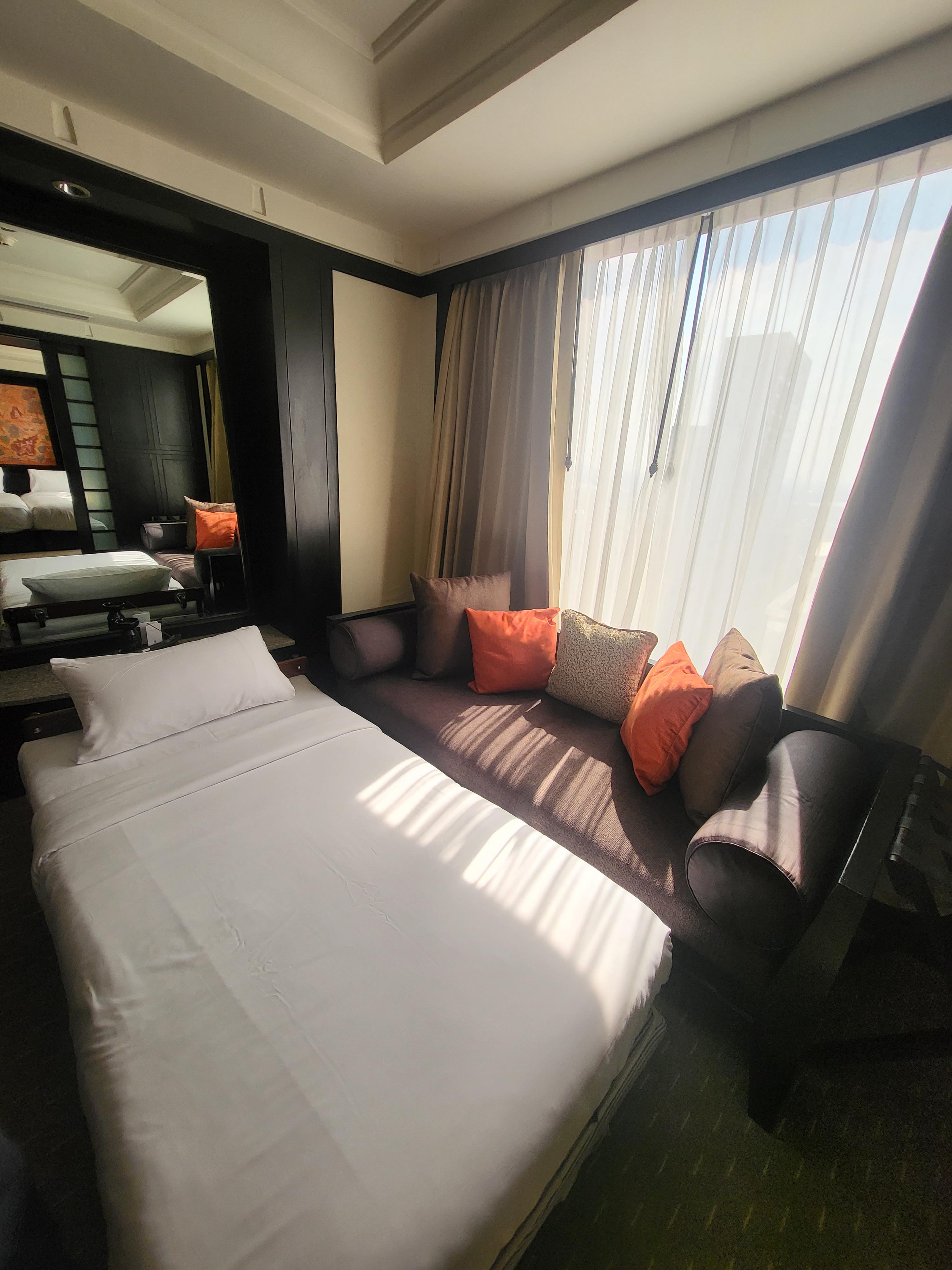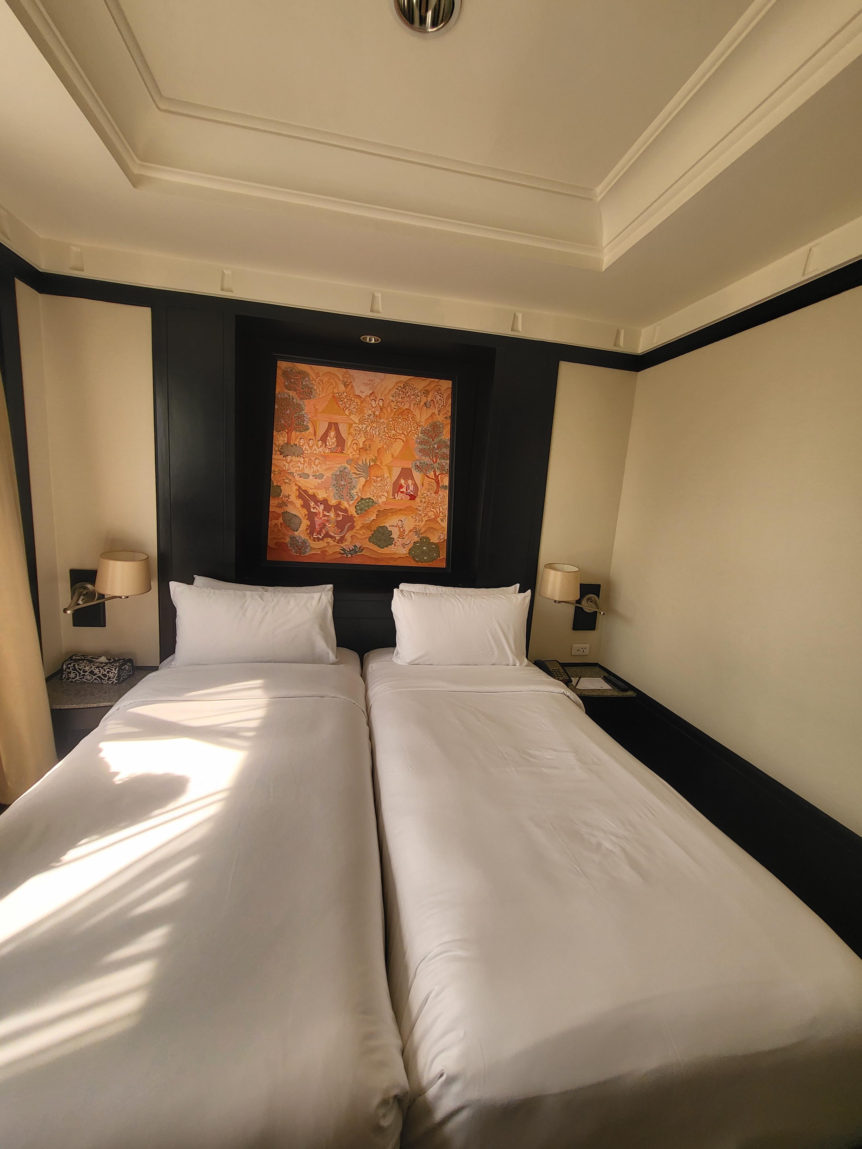 태국호텔 반얀트리방콕의 객실 내부 모습이예요. 한참 알아듣기 어려운 직원의 말을 겨우 알아듣고 올라오니, 왠걸 방 크기가 꽤 크더라구요?! 거실과 방이 나뉘어져 있어서 거실 문을 닫을수가 있고 거실쪽에 간이침대가 준비되었어요. 간단한 테이블도 있고 거실 사이즈가 꽤 되었어요. 방은 트윈배드 두개가 들어가있고 침대앞쪽으로 캐리어 짐을 두고 정리해도 넉넉할 만큼 공간이 나왔어요.