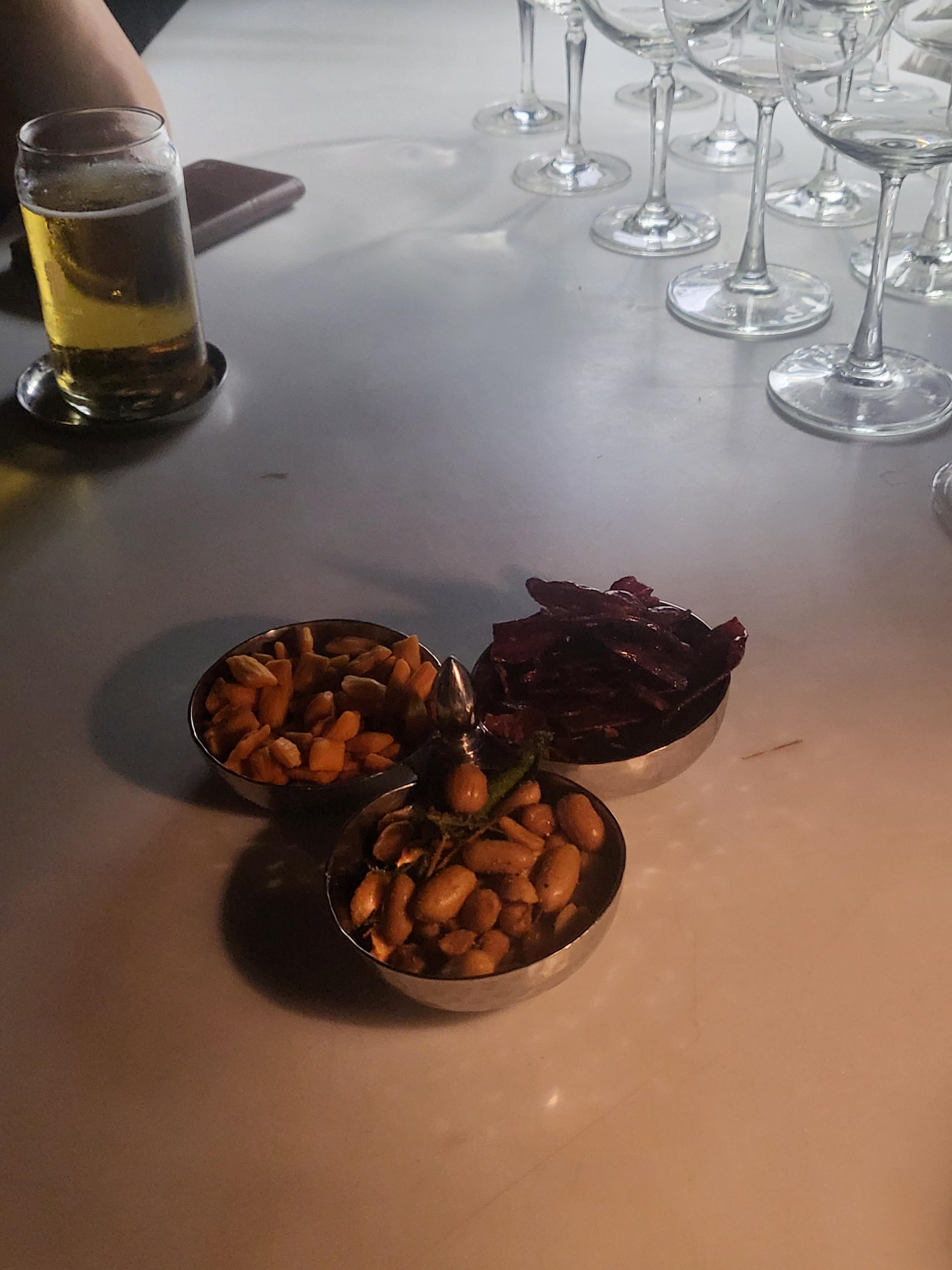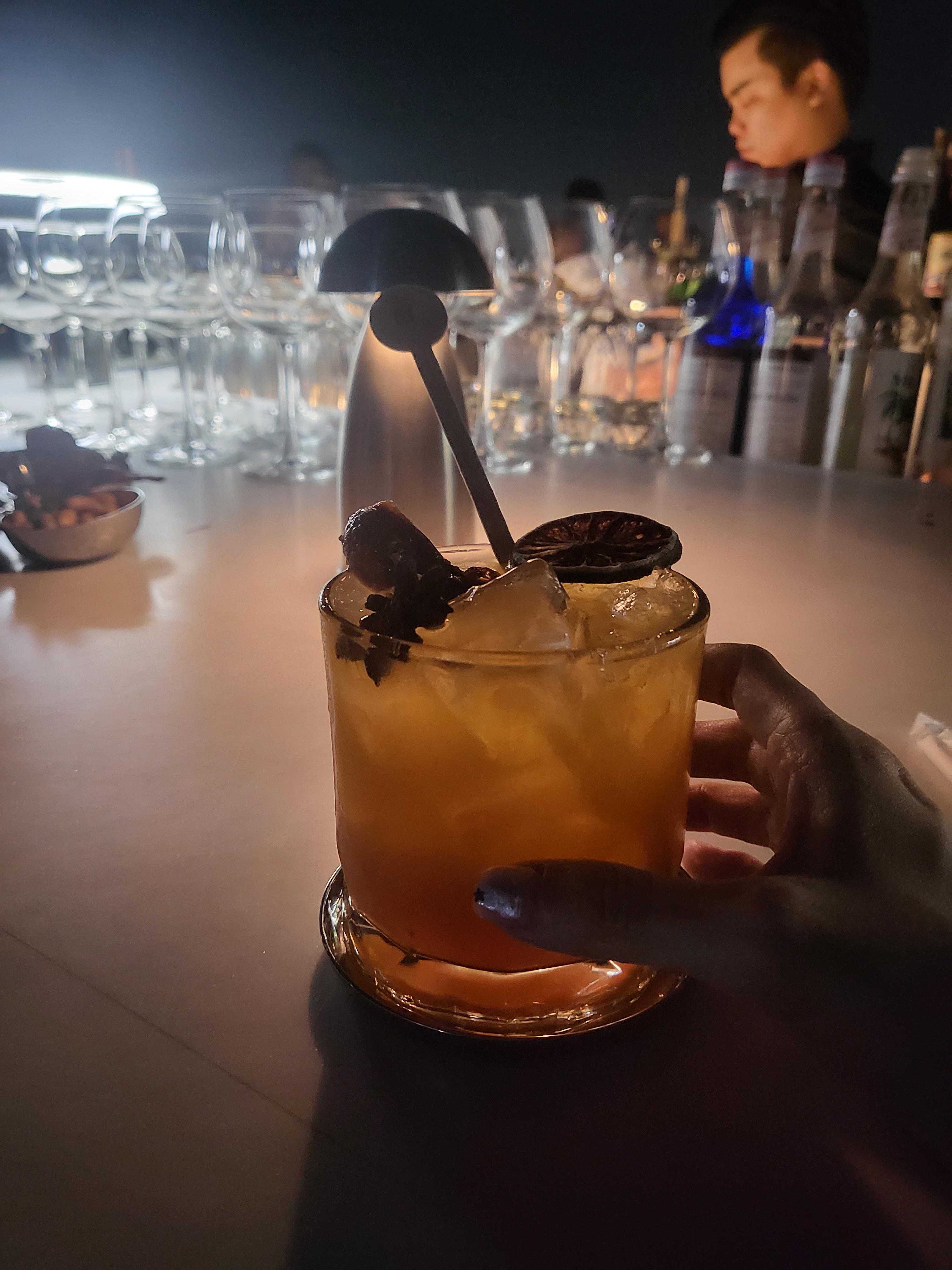 기본 안주로 견과류가 나오고 하루종일 더운곳에 있다가 높은곳에 올라오니 바람도 선선하고 분위기도 너무 좋았어요. 음악도 너무 시끄럽지 않아서 고층 루프탑이 좀 새로운 경험이었어요.조명 레이저를 하늘로 계속 쏘는데, 레이저 움직이는거 본다고 하늘을 쳐다보면 너무 까막득한 하늘이 가까이 보여서 높이 있다는게 실감이 나더라구요. 고소공포증이 있는 저는 하늘을 오래 쳐다보지도 바깥 야경을 오래 쳐다보는것도 좀 힘들기 했어요 ㅋㅋ