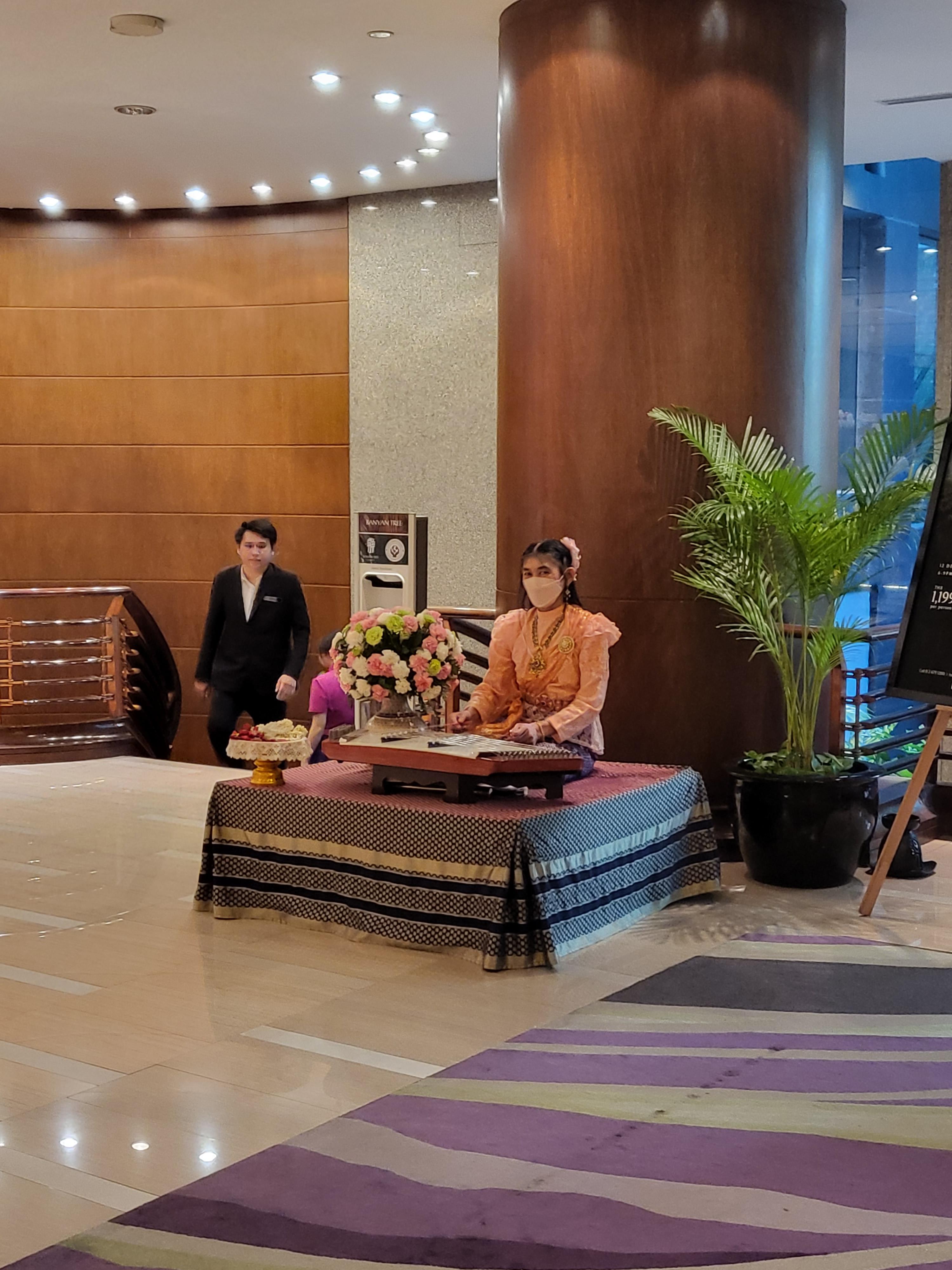 태국호텔 반얀트리 방콕의 로비 모습이예요. 전통악기를 연주하시는 분이 계시고 12월의 태국여행이었기 때문에 가는곳 마다 크리스마스 트리로 장식을 해놓았어요. 해가 너무 쨍쨍한 여름 나라에서 가는곳마다 크리스마스 장식을 보니 왠지 작년 크리스마스 장식을 안치운?듯한 느낌이었어요. ㅋ