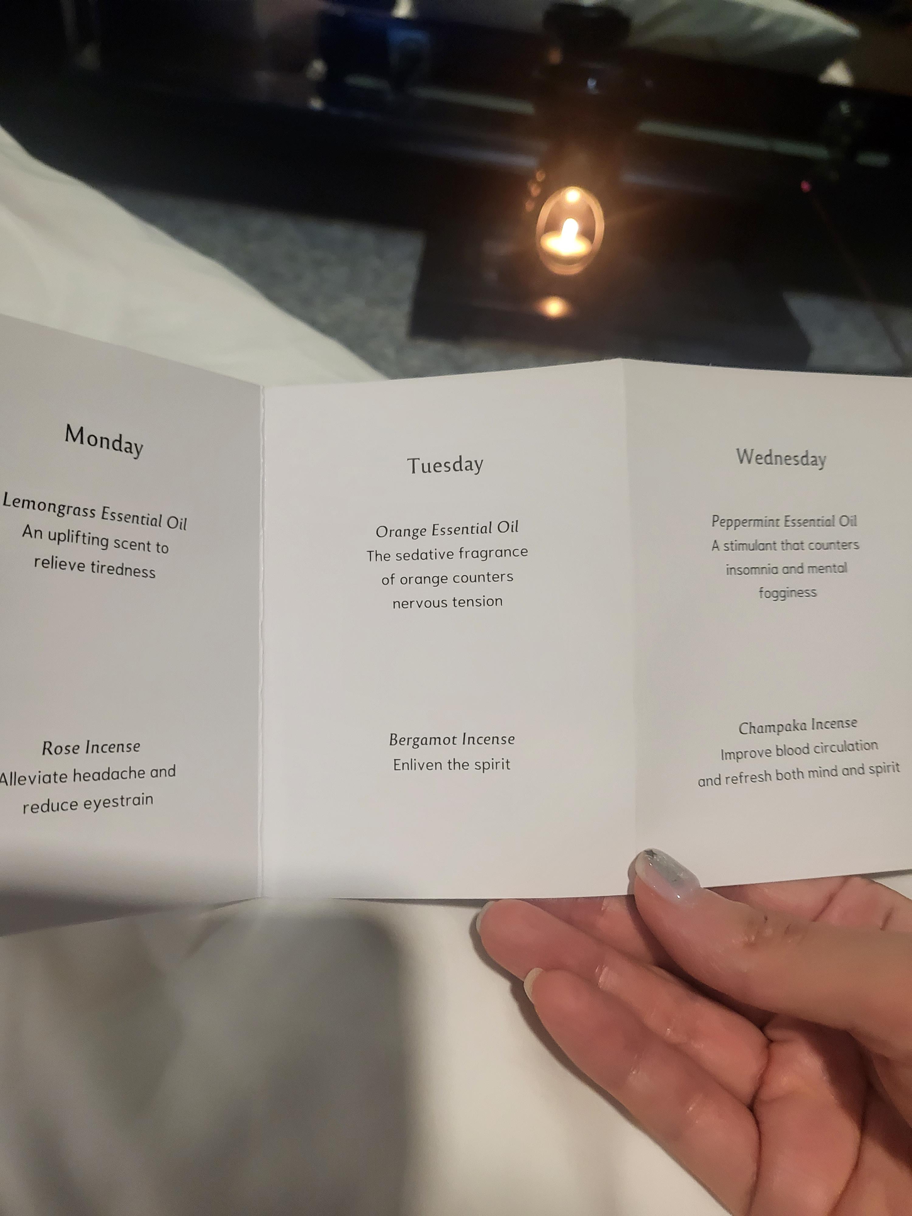 간이침대 머리맡에는 인센스스틱과 초도 준비되어 있어요. 요일별로 다른 향을 준비한다고 안내되어 있어요.