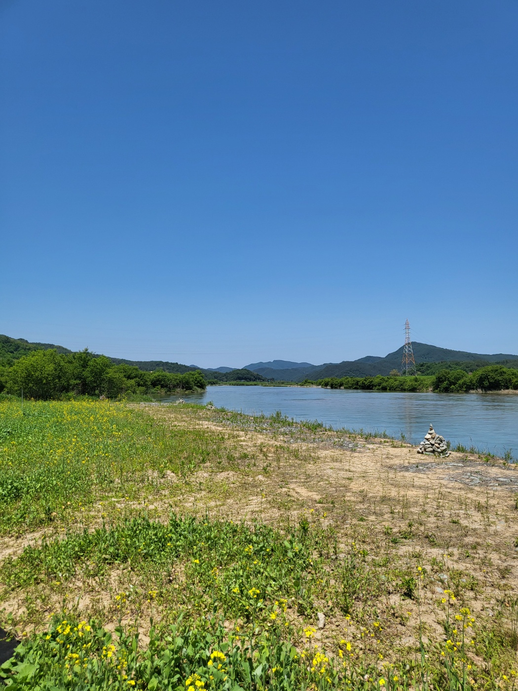 합천 핫들생태공원 작약꽃밭에서 한쪽으로 걷다가 빠져나오면 합천황강과 유채꽃밭이 펼쳐집니다. 너무 평화로운 풍경이예요. 조금 시간을 넉넉하게 가지고 온다면 트레킹을 해봐도 좋은 추억이 될 만큼 아름답게 조성을 해둔 합천핫들생태공원 입니다.