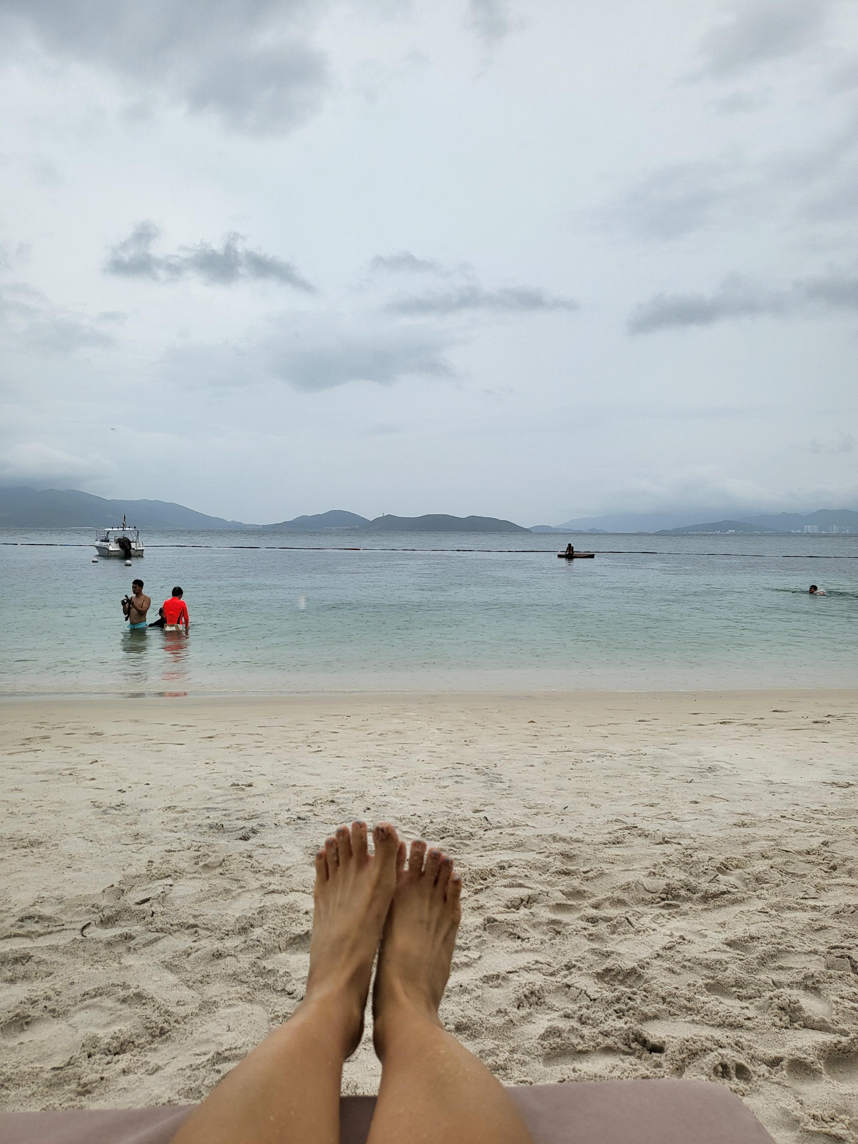 물이 너무 맑아서 흐리다가 비가 왔음에도 불구하고 비가 온다고 들어가는 사람들 한명도 없었고 물고기도 많아서 아미아나리조트로 오길 잘했다는 생각이 들었었네요. 저는 이날 스누쿨링도 무서워서 포기하고 결국 호핑투어를 못할것 같단 판단이 들어 취소했습니다 ,, ㅋㅋ 해변에 앉아서 구경하거나 얇은 물에서 놀고 짝꿍은 스누쿨링 하면서 물고기도 많이 보고 한참 물놀이 하다 나왔어요.